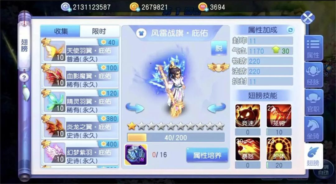 可以说翅膀是一个重要的属性来源,普通玩家日积月累,氪金玩家一步到位用桃子提升!