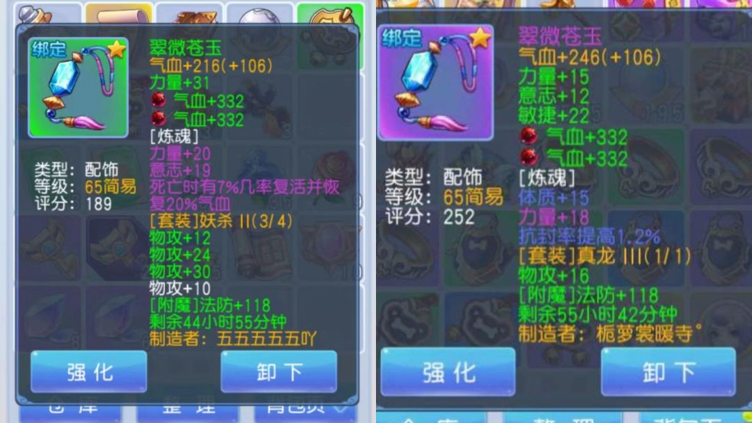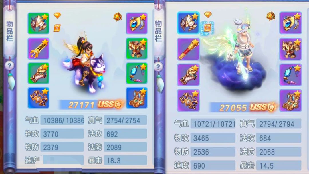 以这两个对比图为例,我们可以看到前者只有两个紫简装备,后者足足七件,但是双方的属性差距有多少?不可否认,综合属性来讲,后者高于前者,但是作为一个物理职业,他们最关键的属性是物攻!这就是单属性的魅力!
