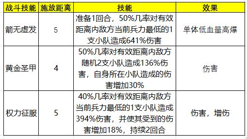 远程弓兵英雄。一技能可锁敌,针对低血量队伍造成单体高爆伤害,非常适合终结队伍。三个战斗技能均可打出伤害,且施放距离远,适合站后排输出。