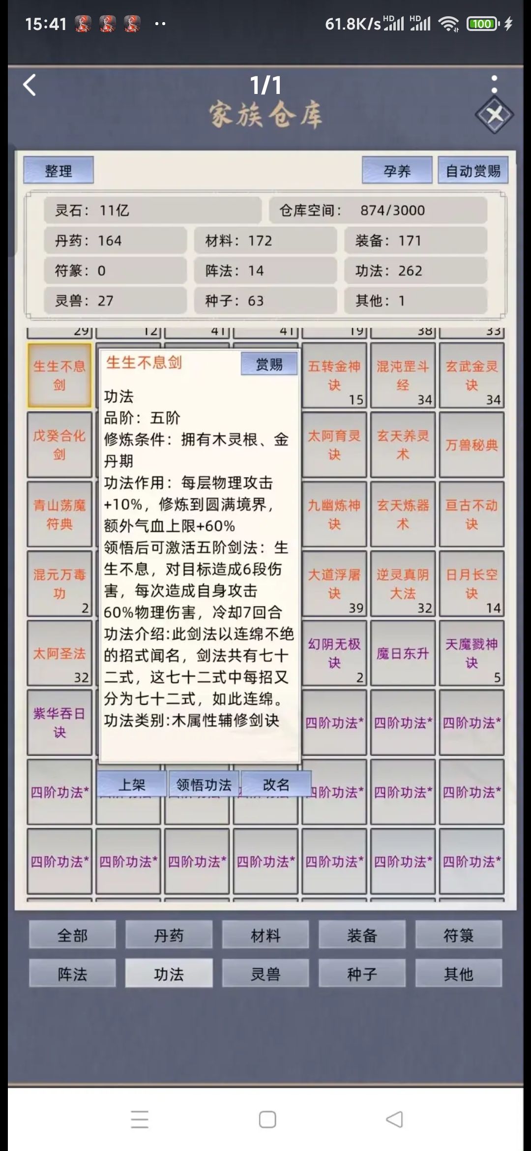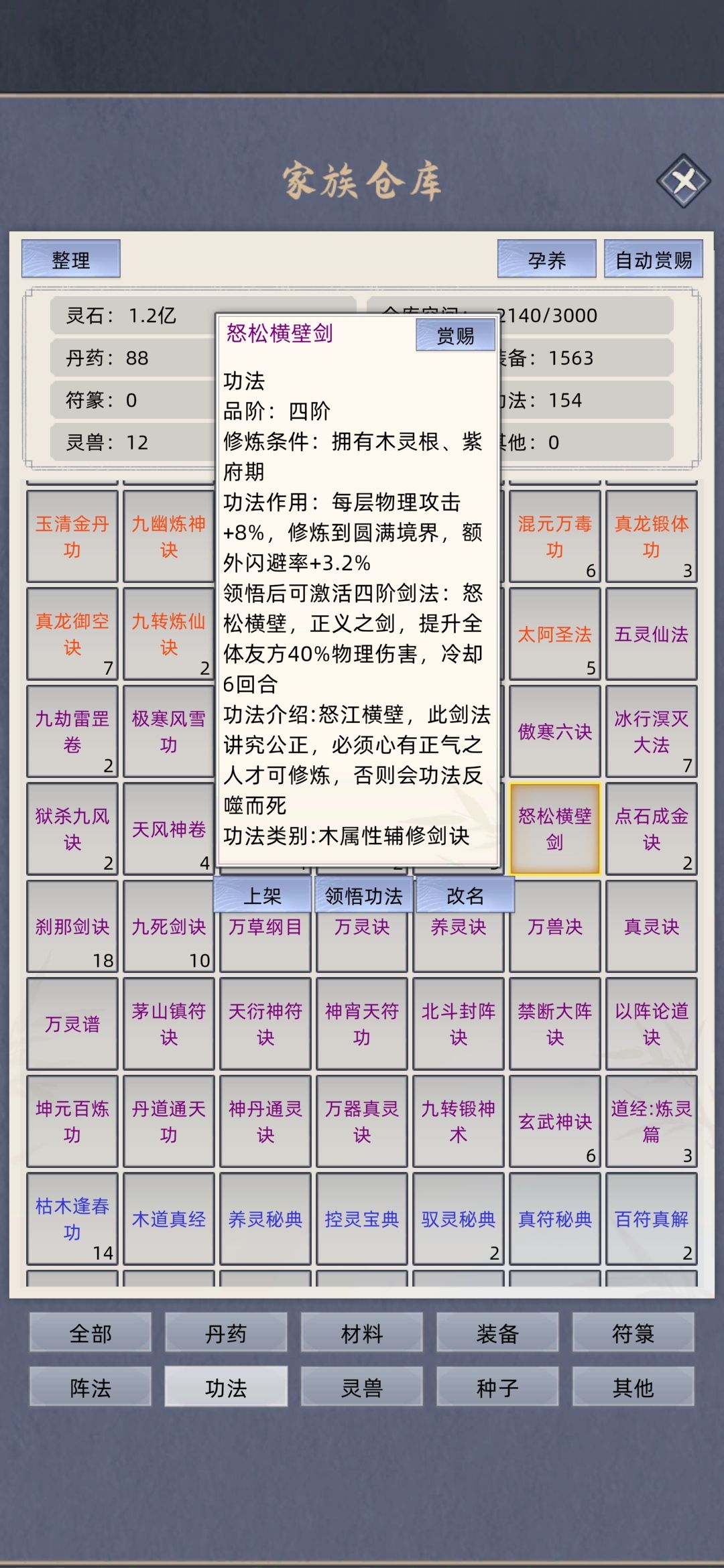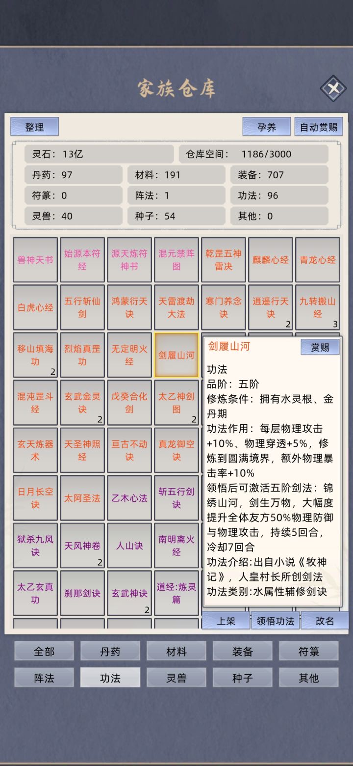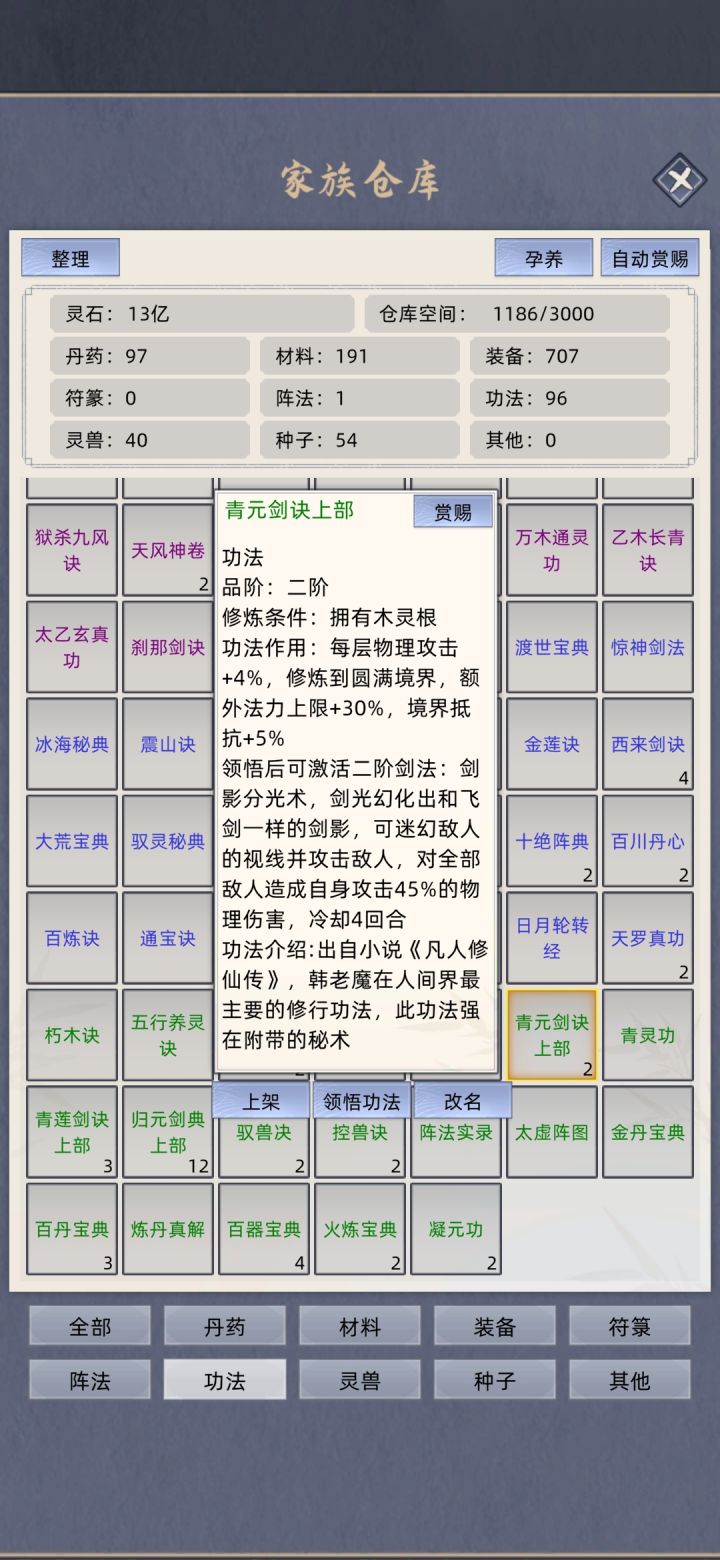 太乙神剑图全体减防顺带清低阶 白虎心经强化 主攻戍癸合化剑悟性不够用归元剑典 天青神功回状态 混元万毒功的属性 刹那剑诀的爆伤物穿 其他灵根剑修天青神功换成物理系功法 木系天青神功不换掉主要还是省操作 毕竟掠夺的时候点一个人比点两三个要快上不少