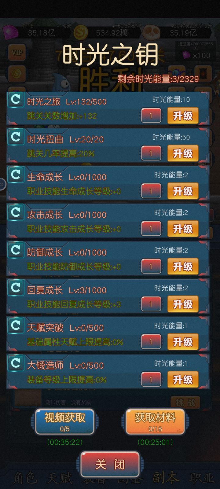 【时光之钥】每天可以点击获取,跟广告差不多有恢复时间,优先点满【时光扭曲】,其次【时光之旅】,这个比较耗时,先点完再看其他的。
