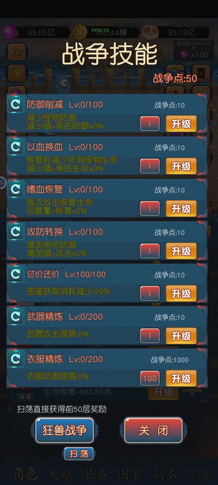 【战争技能】通过【狂兽战争】来获取技能点,目前我的优先级是☛讨价还价>鞋子精炼=图鉴强化>二阶神器,其他的我没管,大家可以自己试属性。