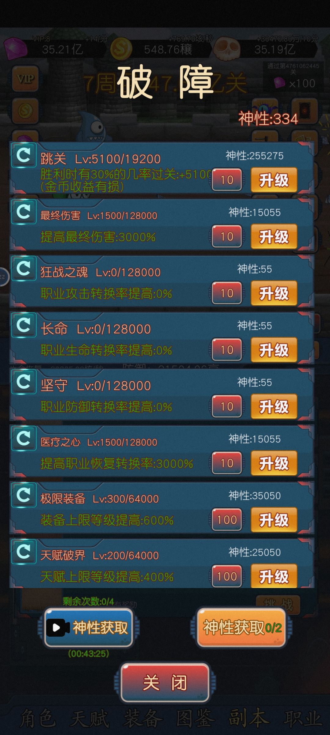 【破障】优先级☛跳关>医疗之心=最终伤害,装备等级,天赋受限的话可以加对应的极限装备和天赋破界,其他随意点。