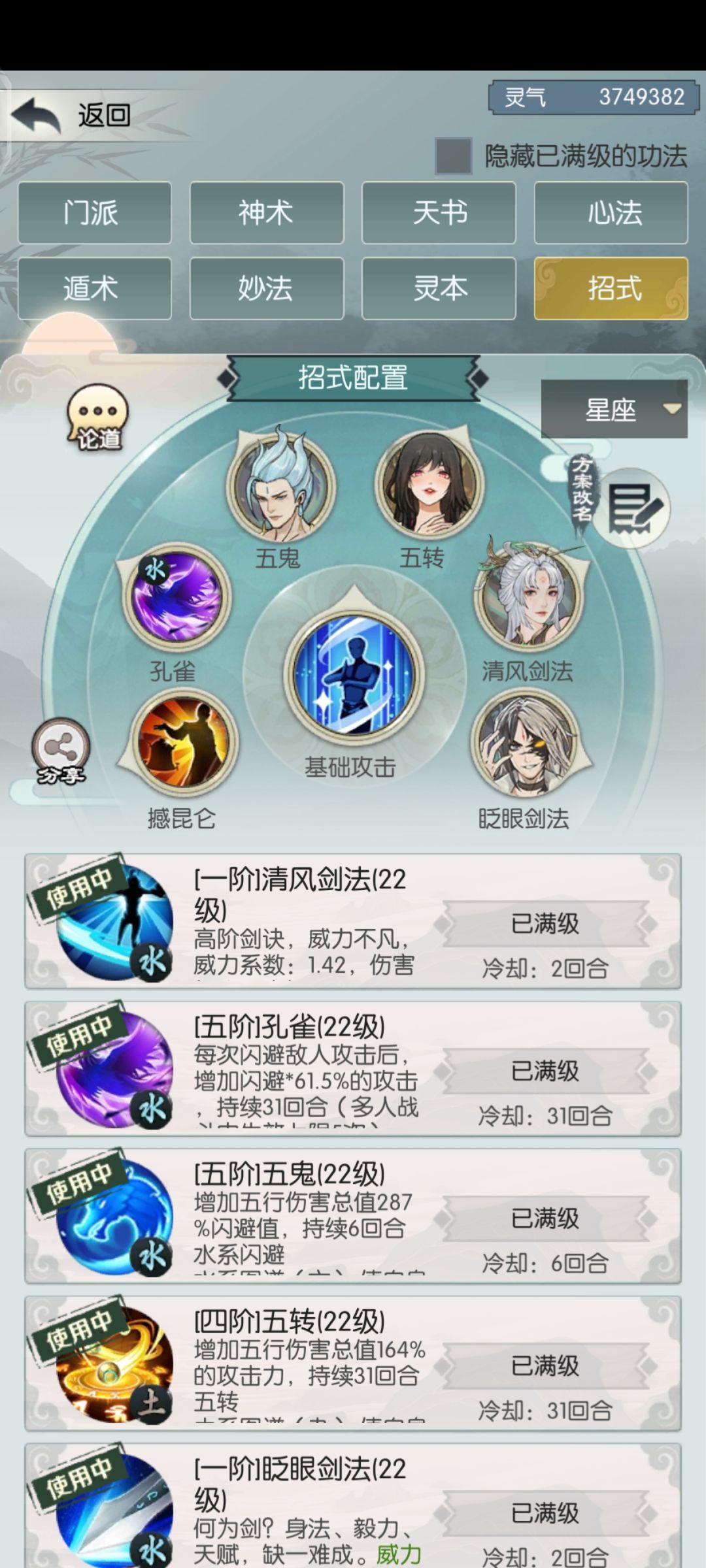 2.人物技能左至右:撼昆仑,孔雀明王诀,五鬼迷踪诀,五转圣功,清风剑诀,眨眼剑诀。