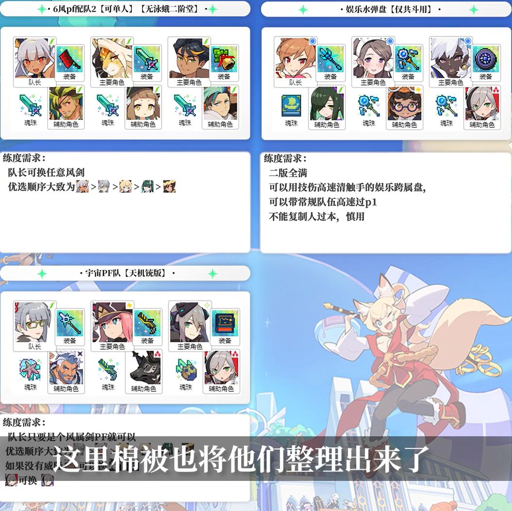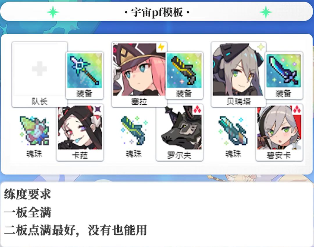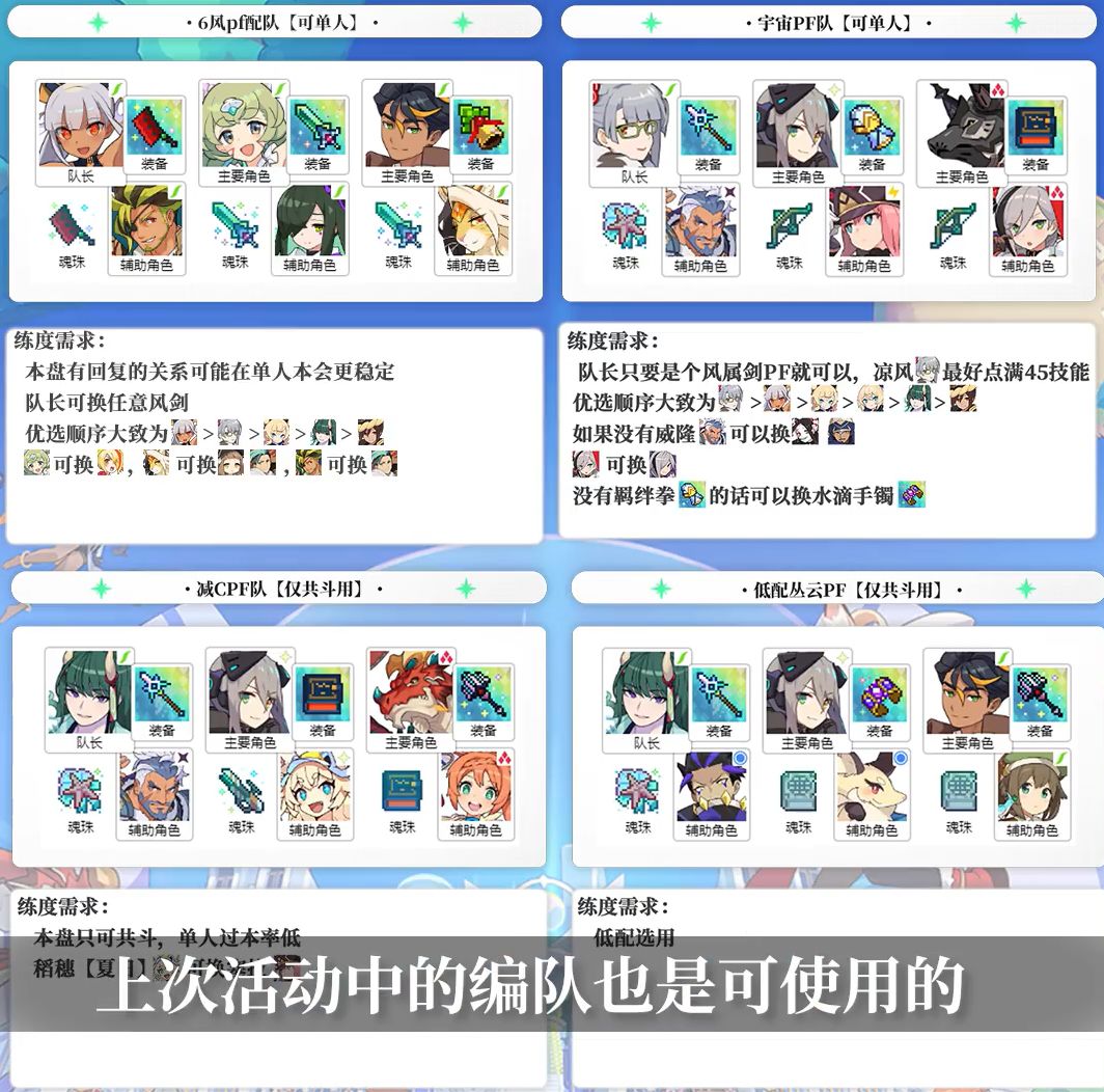 本次夏活复刻利好pf体系,但是目前pf体系变化并不大,所以更新了几个新角色队伍。如果此前没有为纯色风PF抽取角色的小伙伴们直接使用宇宙pf也是完全没有问题的。