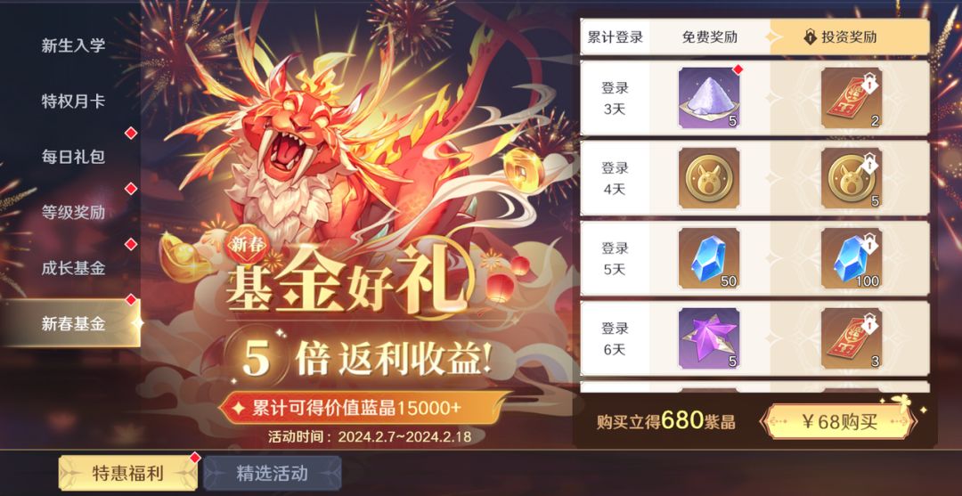 新春基金在春节期间限时开放;学员购买新春基金后累计登录天数可以获得大量幸运币,非常划算~幸运币可以在幸运转盘中抽奖,除幸运币外也可获得珍宝券(新春商店代币)、星玉、紫曜碎晶、蓝晶、白石沉砂等奖励。