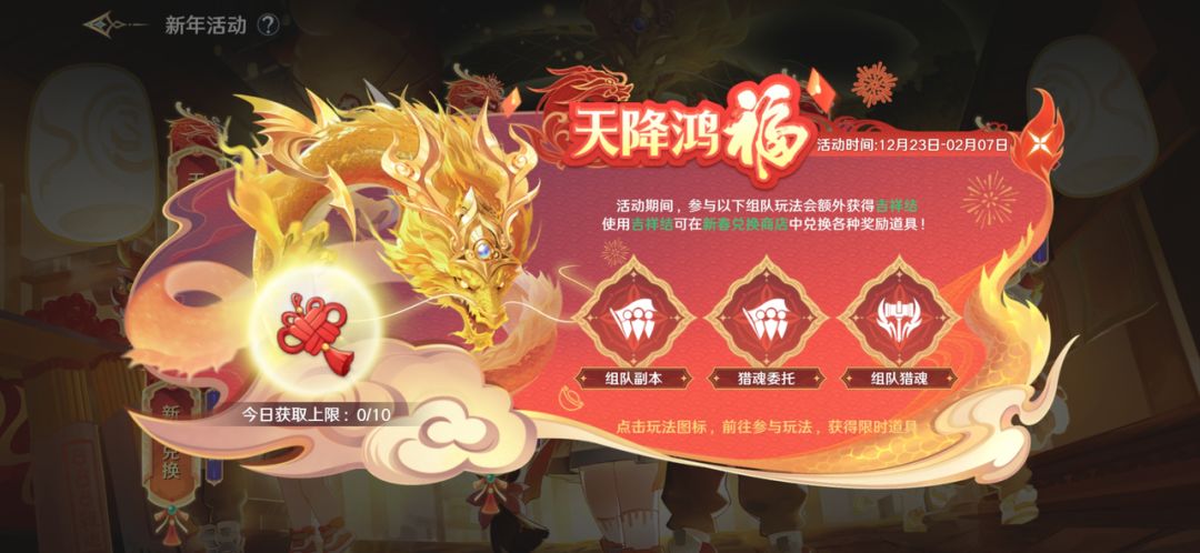 活动期间玩家每日活跃参与组队副本、猎魂委托、组队猎魂可获取吉祥结。玩家每人每日最多可获得10个吉祥结,吉祥结可以在新春商店兑换各种珍稀奖励。