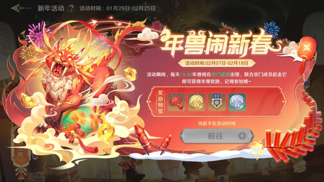 活动期间,每日19:45年兽将在宗门盛宴中出现,学员们加入宗门参与宗门盛宴玩法可以共同挑战年兽,将年兽赶走可以获得吉祥结、宗门贡献、金/银魂币等奖励。