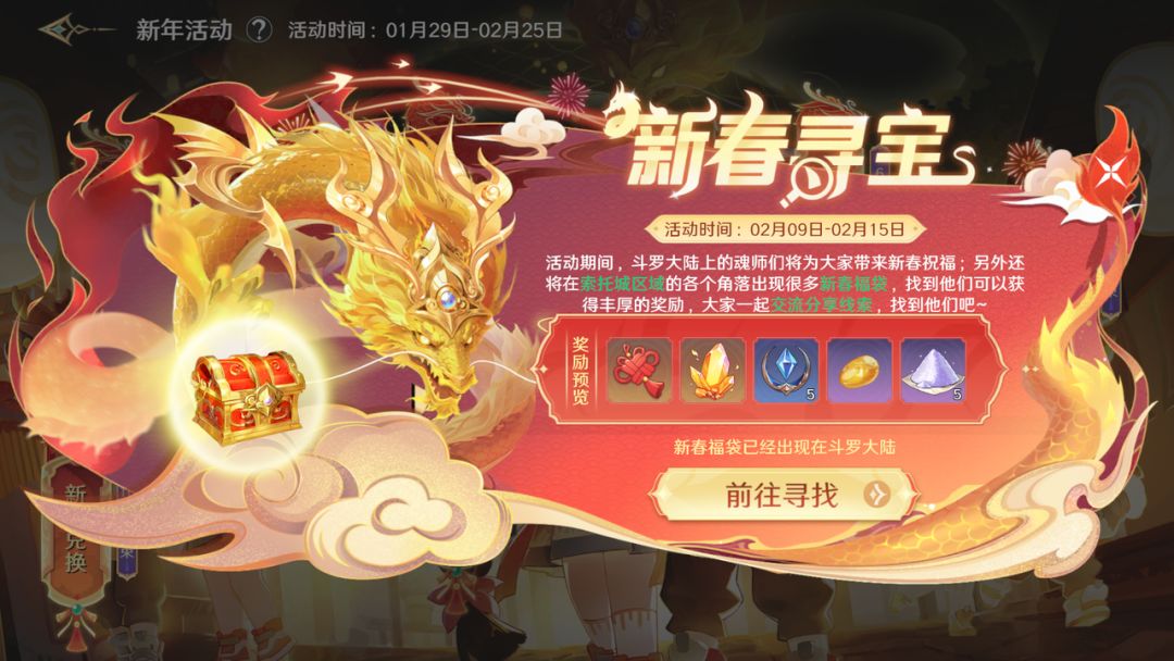 活动期间,与索托城的魂师对话有概率触发;触发后可以获得与新春福袋等同的奖励。索托城的角落中存在新春福袋,寻找到的学员最高可以获得吉祥结、闪耀结晶、大地神息、中阶骨蕴石、白石沉砂等。