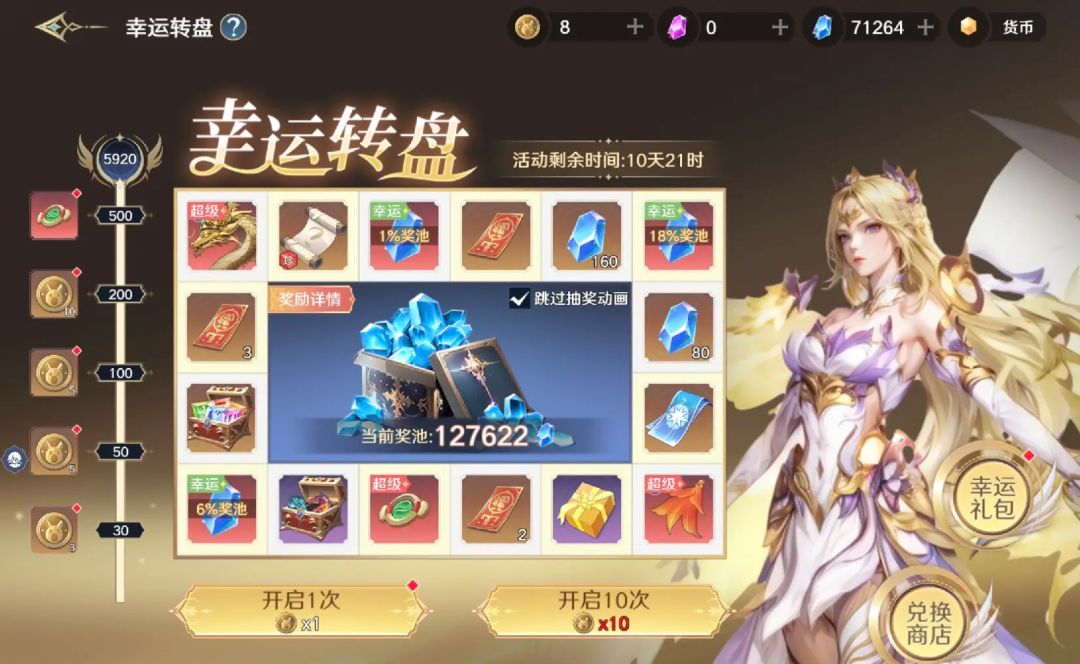 每次抽取消耗1枚幸运币,幸运币每枚80蓝晶;转盘中有概率获得18%剩余奖池。