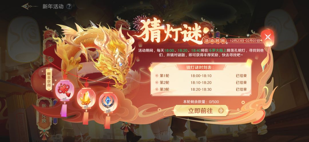 活动期间,每日18:00、18:20、18:40在天上会有孔明灯降落;寻找到之后可以看到谜题,猜对谜题可以获得吉祥结、闪耀结晶、大地结晶等奖励。每轮灯谜会的孔明灯会有数量限制(500个);领完就只能等待下一轮,推荐学员们尽快前往猜谜。