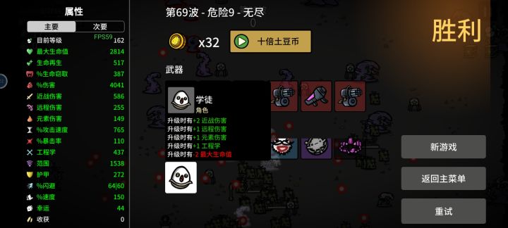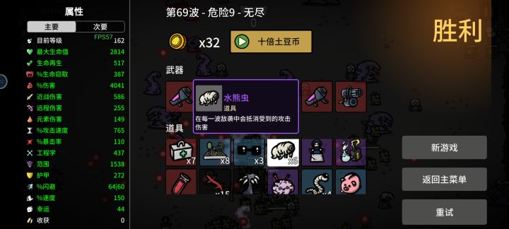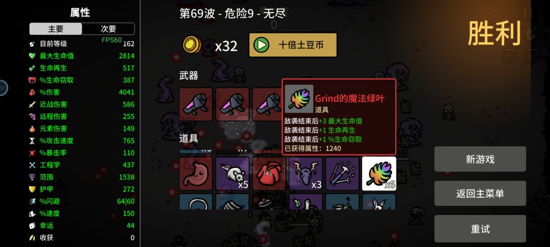 4、40关以后小怪多的离谱(为了击杀数量把全部加敌人数量的道具全都点了),这个时候幽魂类武器就开始跟不上了,唯有买核弹武器 通过范围爆炸来解决。在50关之前卖掉幽魂仗,买出两把核弹武器,这个期间幽魂斧继续叠攻击加成,加上生命窃取和速度转换为攻击的道具,攻击加成必定能完成以千计数。