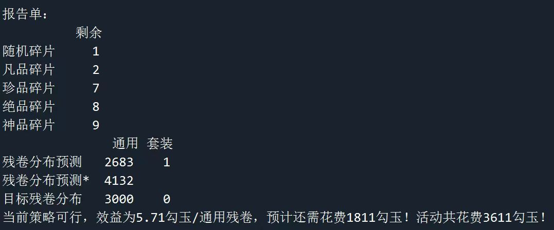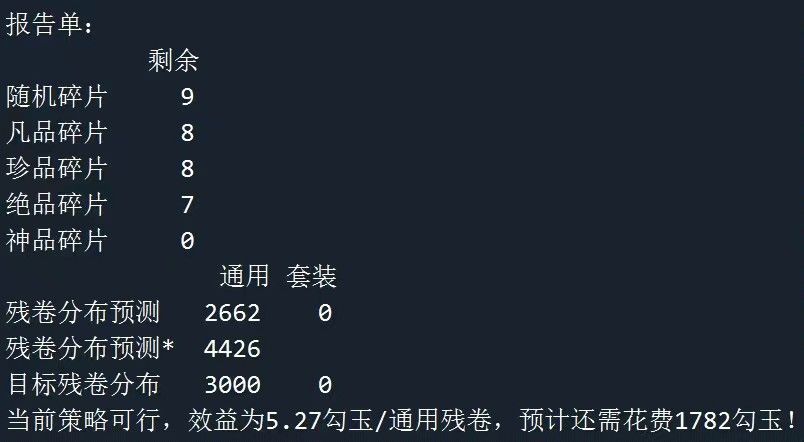 此时,有意思的地方来了!上述三位我的朋友,他们有着同样的目标,用了相同的策略,计算得到的他们的效益分别是5.27,5.75,5.71;注意,从报告中看出,后两位效益较高的朋友,还未在商店购买神品碎片凑十,倘若他们这么做了,估计效益还会降低。
