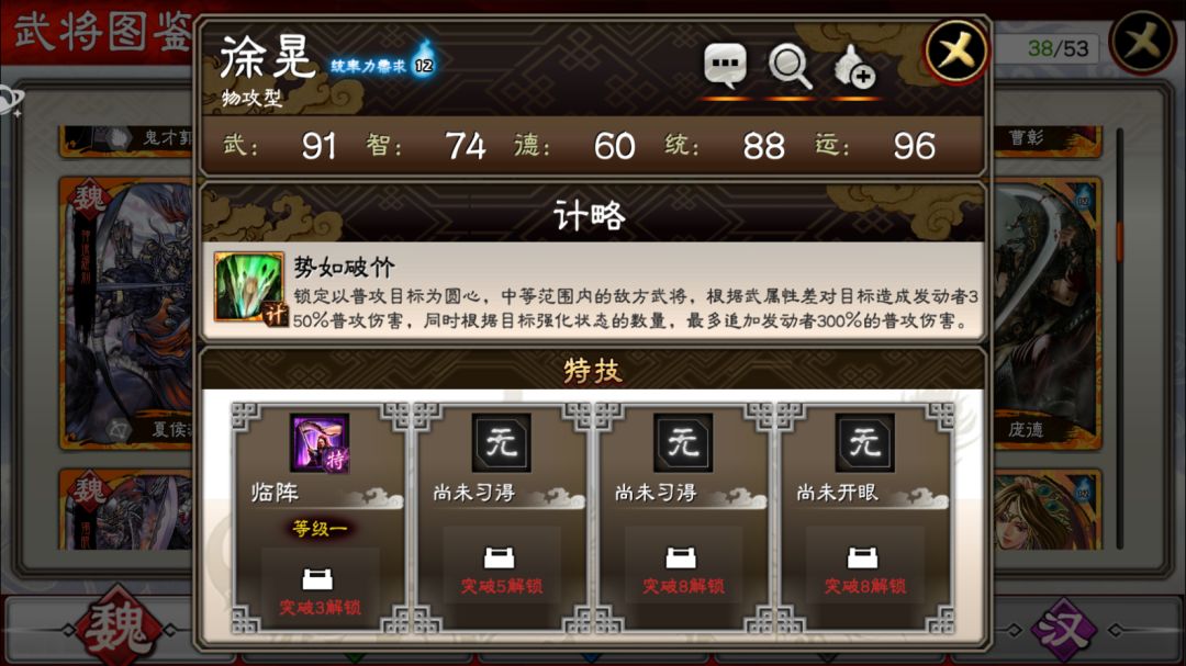 可以看到徐晃整体属性中以运力值最高,达到96