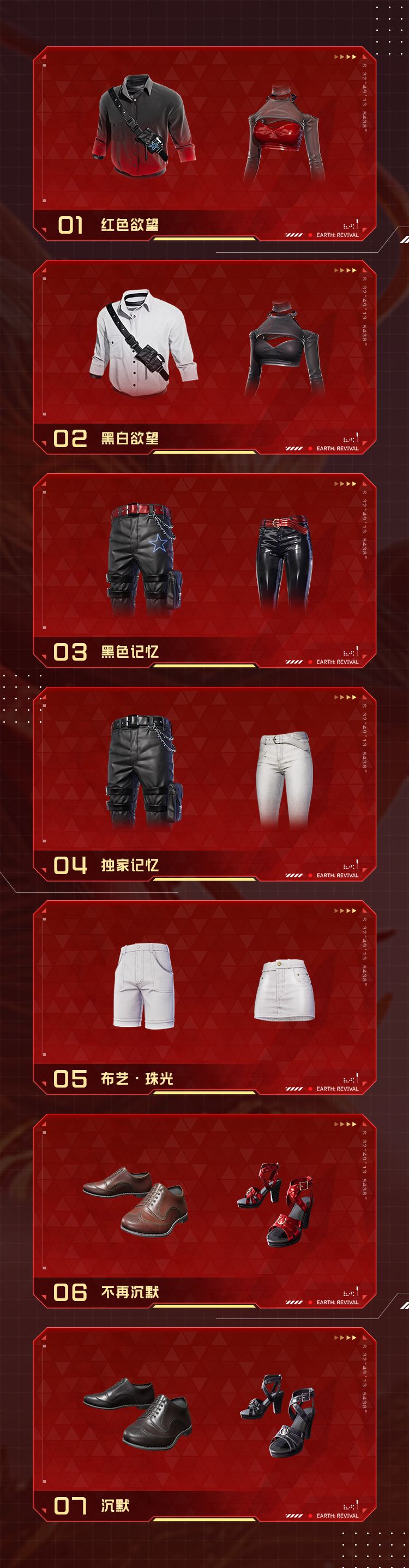 此次的单品都将上架商城直售。「红色欲望」、「黑白欲望」上衣售价380晶核,「独家记忆」、「黑色记忆」下装售价280晶核,「沉默」、「不再沉默」鞋子售价180晶核。