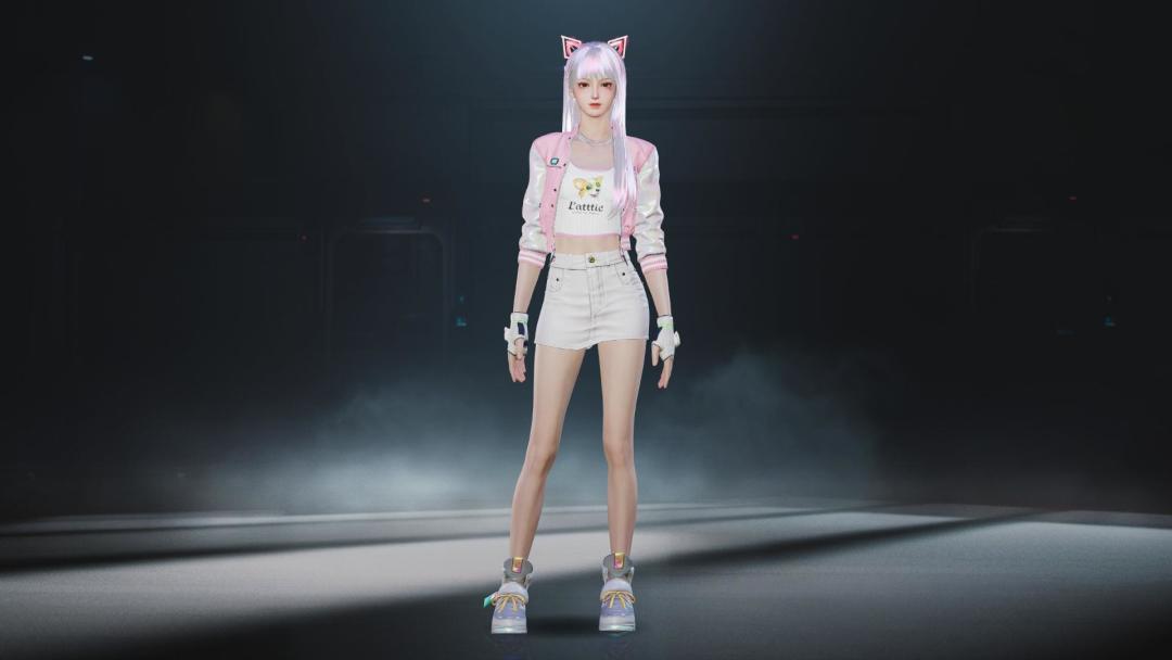 「布艺·珠光」女款下装为A字裙版型,白色的牛仔布料轻盈自在,搭配上粉白色的动感街头上衣和二维世界运动鞋,显得青春洋溢,动感猫猫耳朵活力满满!