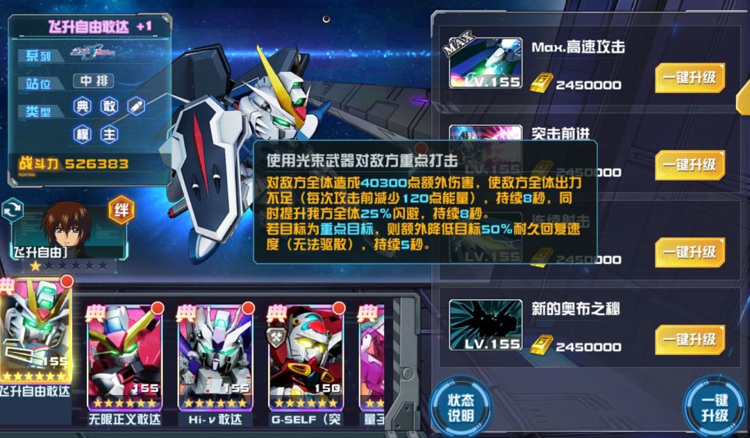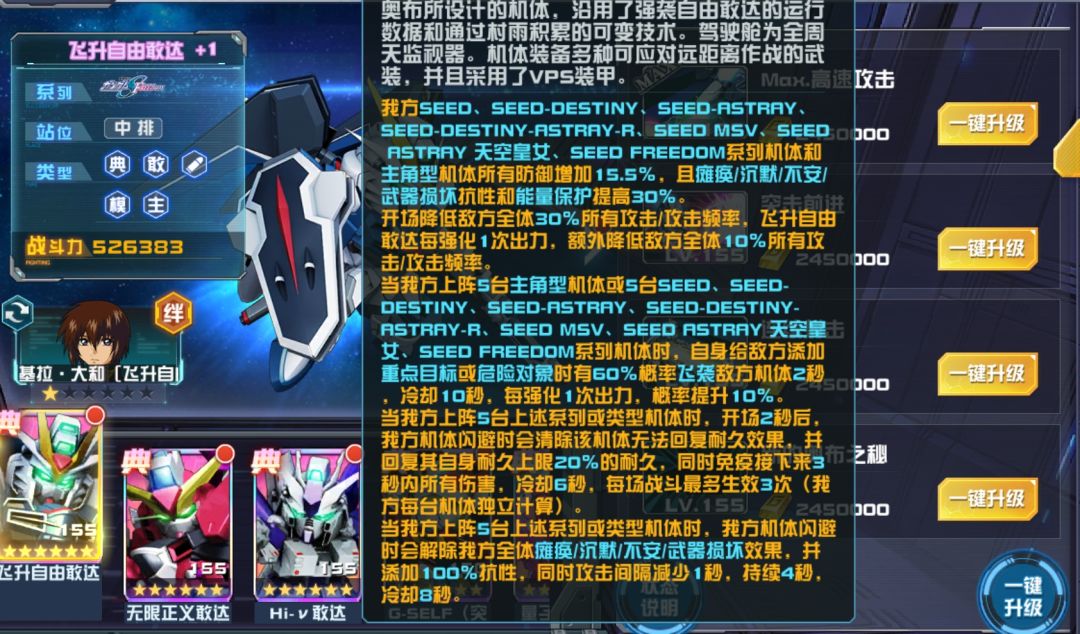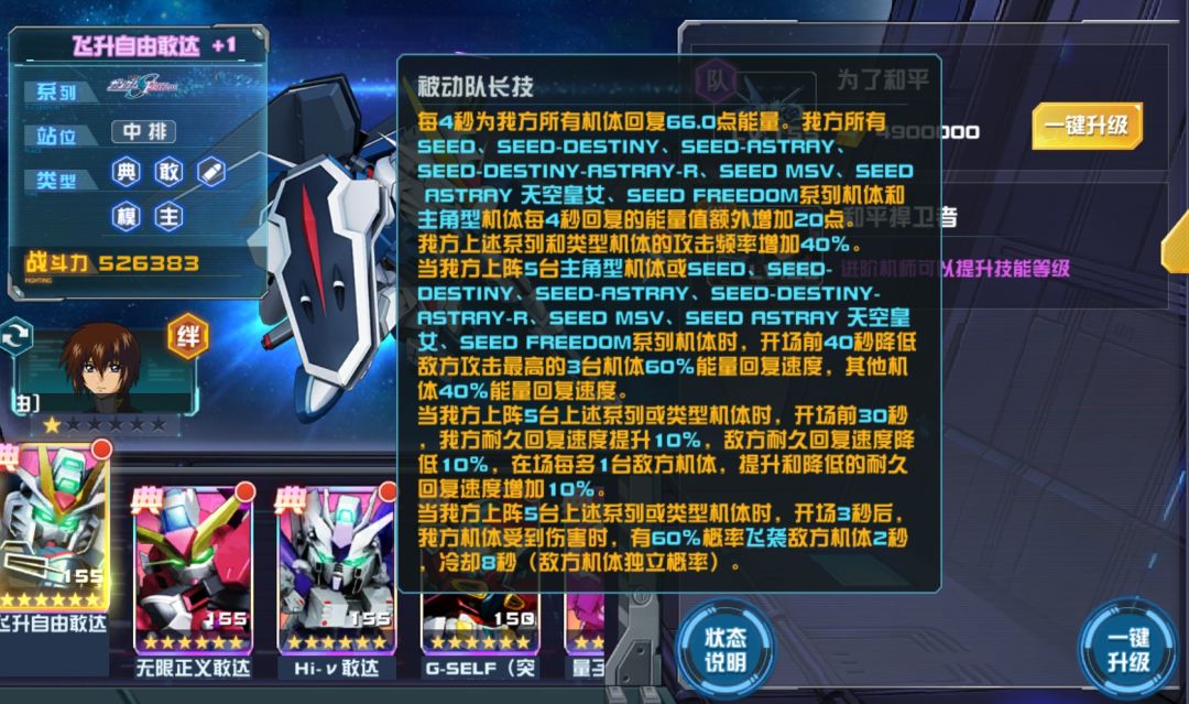 当我方上阵5台上述系列或类型机体时,开场后,飞升自由敢达提升28.0%所有攻击和能量回复速度,同时飞升自由敢达攻击时清除自身无法回复能量效果,并回复280点能量,冷却8秒。