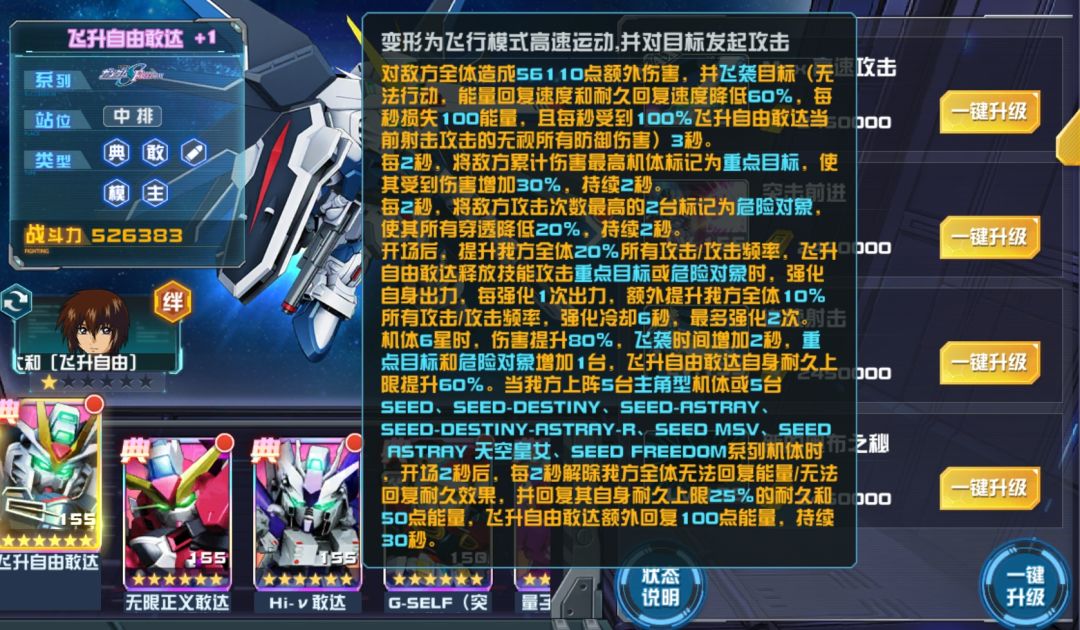 开场后,提升我方全体20%所有攻击/攻击频率,飞升自由敢达释放技能攻击重点目标或危险对象时,强化自身出力,每强化1次出力,额外提升我方全体10%所有攻击/攻击频率,强化冷却6秒,最多强化2次。