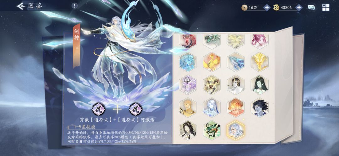 “剑神”神助:战斗开始时,将自身基础增伤的7%/8%/9%/12%/15%共享给友方同排侠客,最多可共享20%增伤(共享效果可叠加),同时自身增伤提升8%/10%/12%/15%/18%。
