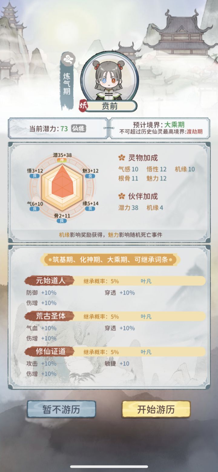二套方案:1、气感/机缘/潜力3个5。稳定渡劫(图四很意外的合体期,84的潜力合体期,很随机)但是可以刷出高战的概率不高。