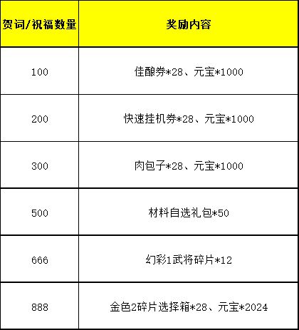 在本帖下方盖楼,相互贺岁祝福,共度新春。本帖下方“贺词祝福”数量达到指定数量将会发放全服奖励。