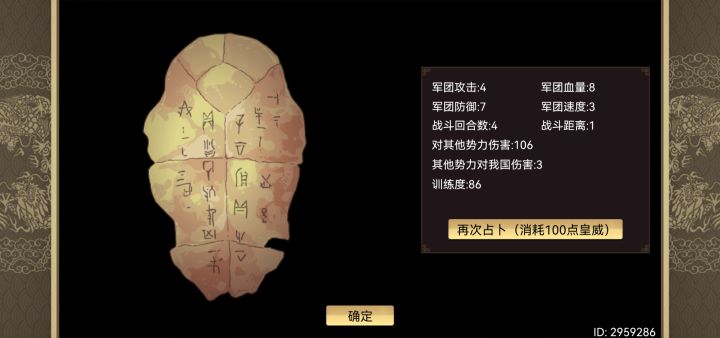 开局招兵招到15w,造一支民兵兵团出来,然后每回合sl一下民兵属性就行了,只要不是攻防都是1,或者己方伤害30对方伤害180这种就行,基本上双方伤害差不多,然后攻防4-5就够了。