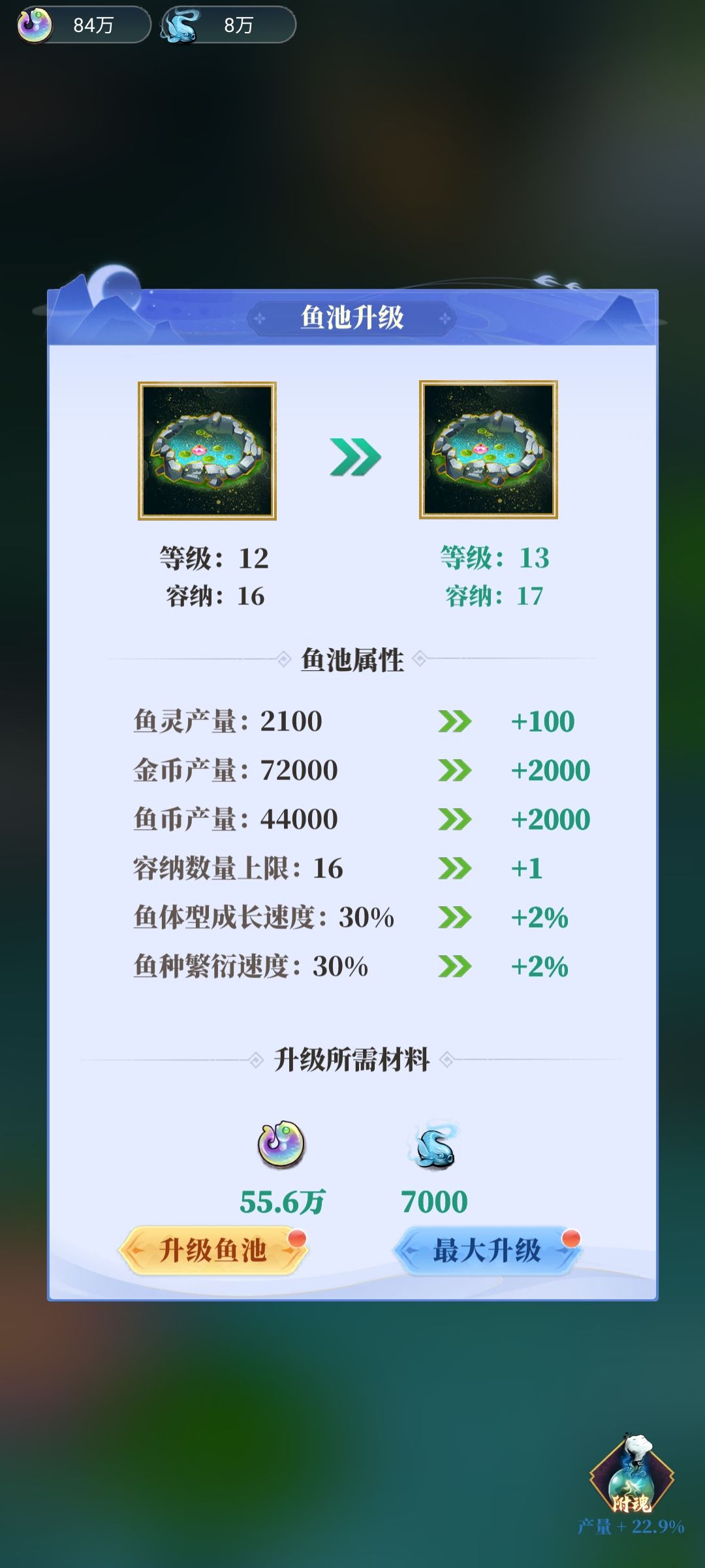 七:鱼池:钓到的鱼可以养在自己的鱼池里面,可以慢慢长大,长到大体型以后可以和符合繁殖条件的鱼有概率繁殖出下一代。通过使用鱼币和鱼灵可以升级鱼池,升级鱼池可以提升鱼池容量上限,鱼的成长速度和繁衍速度,以及鱼池每日金币鱼币鱼灵生产数量。