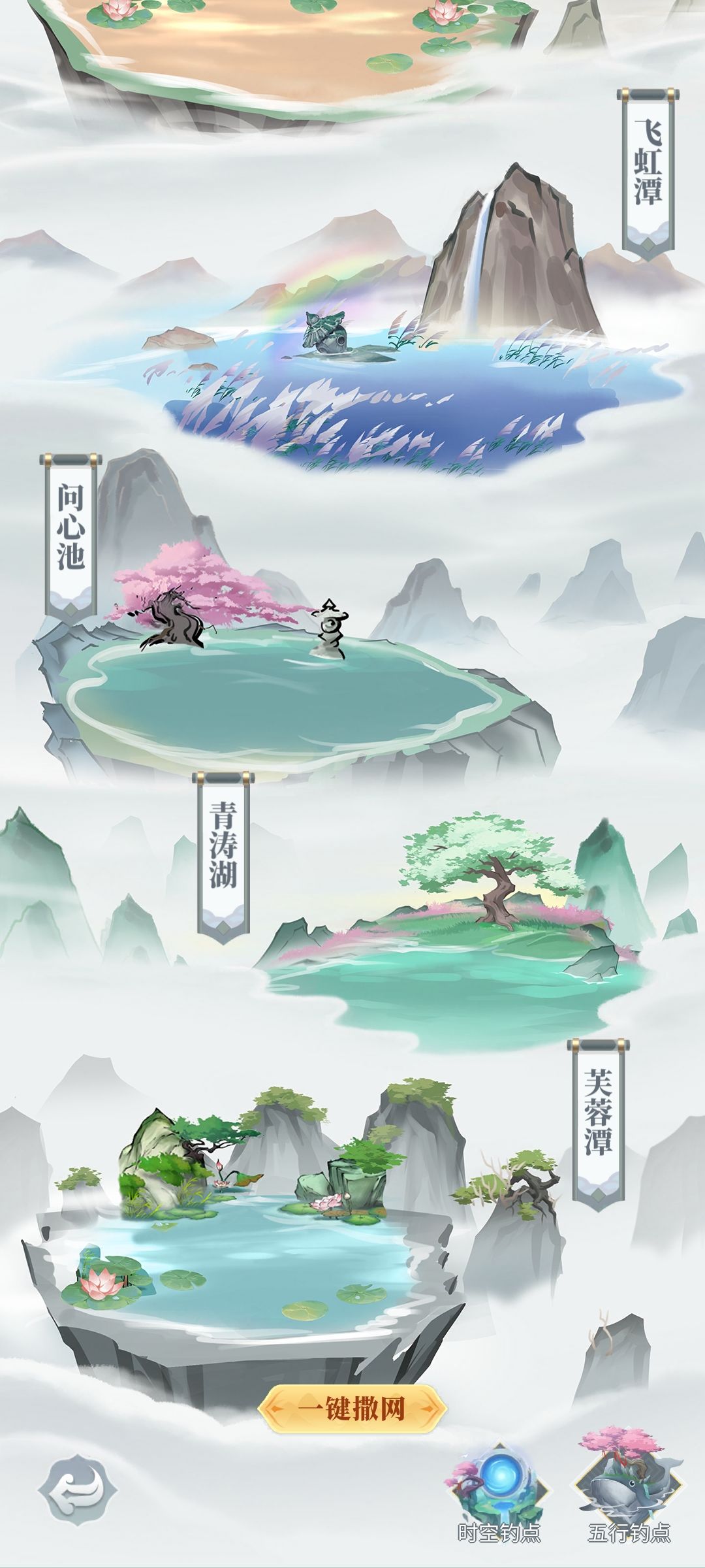五:钓点,目前普通钓点一共有12个,开局会解锁第一个钓点,后面需要完成钓鱼任务提升神龙等级才会解锁新钓点。每个钓点都会有专属的鱼。