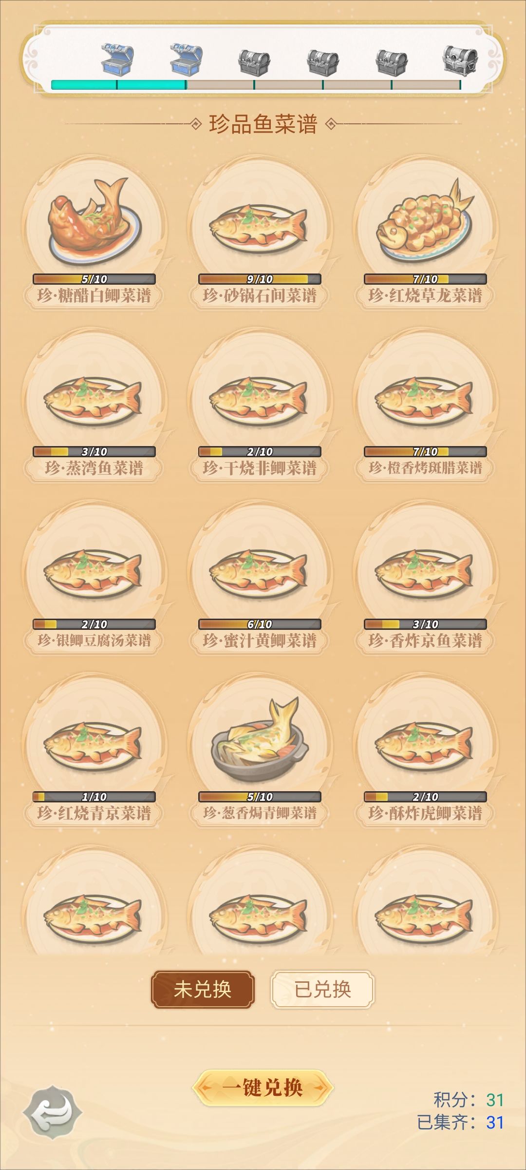 六:菜谱:每种鱼集齐一定数量可以在鱼商那兑换对应的菜谱,解锁以后可以在厨房消耗对应数量品质的鱼来做菜,每种菜都会有不同效果,菜的品质越高效果越好,菜品质和鱼品质是一样的划分。