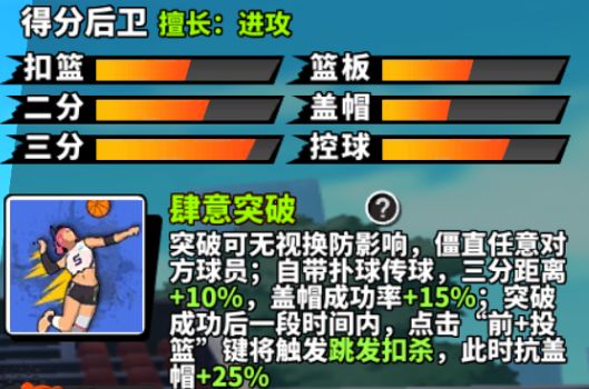 进攻端:突破可僵直任意对方球员,超远三分距离,自带投篮动作以及扣篮动作,突出极致的进攻!