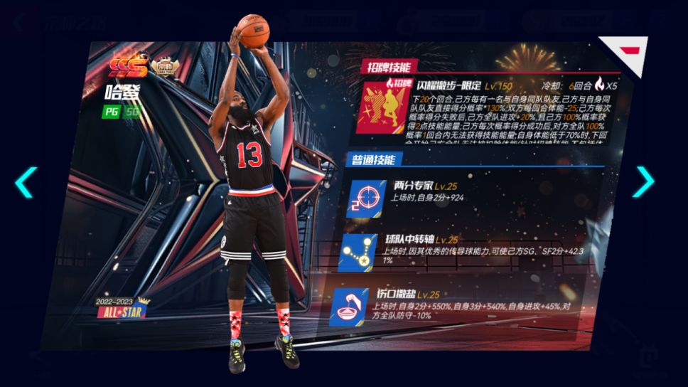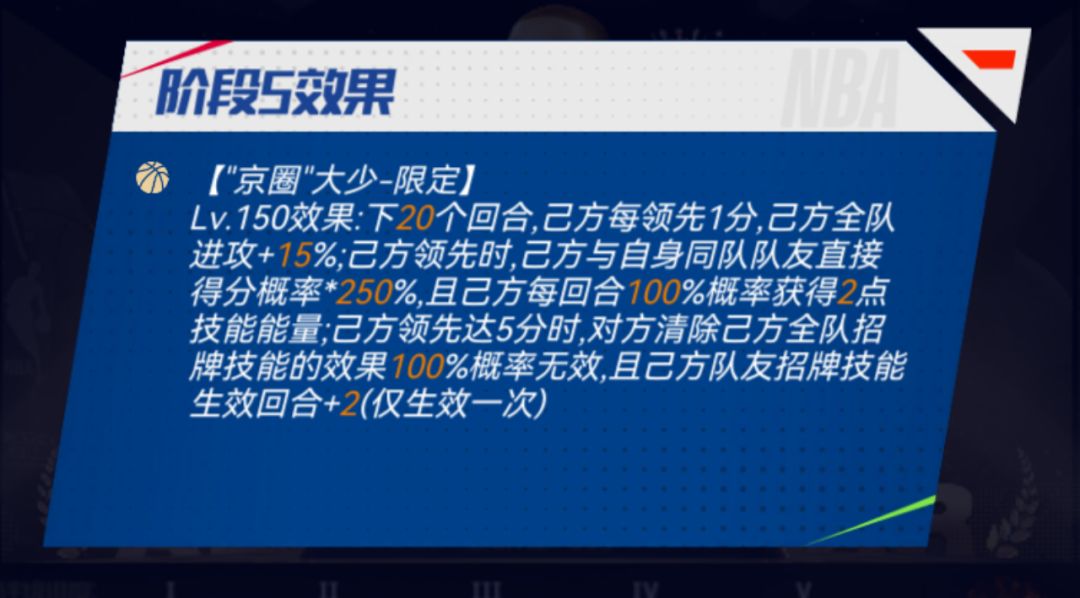 闪耀撤步-限定:下X个回合,己方每有一名与自身同队队友,己方与自身同队队友直接得分概率*X%;双方每回合体能-X;己方每次概率得分失败后,己方全队进攻+X%,且己方X%概率获得Y点技能能量;己方每次概率得分成功后,对方全队X%概率Y回合内无法获得技能能量;自身体能低于70%时,下回合开始己方全队无法被扣除体能(针对招牌技能,不包括体能消耗速度类型)。(预计在上线同时开启迈向巅峰)
