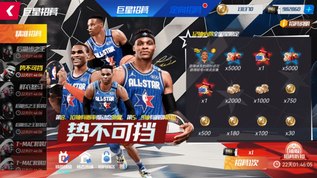 每次“抽一次”,则随机解锁一个奖励格,获取奖励格中的“全明星球员”或“转会费”。至多抽取12次,成功将全明星队威少签约入队!