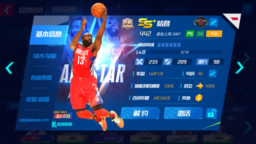 每次“抽一次”,则随机解锁一个奖励格,获取奖励格中的“全明星球员”或“转会费”。至多抽取12次,成功将全明星队哈登签约入队!