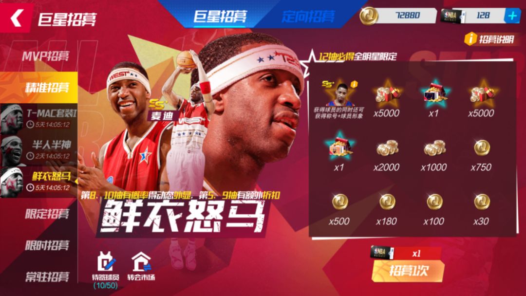 龙年新春福利幸运转盘折扣! 活动期间,可使用【精准招募函】在【精准招募-鲜衣怒马】池中,招募全明星队麦迪。