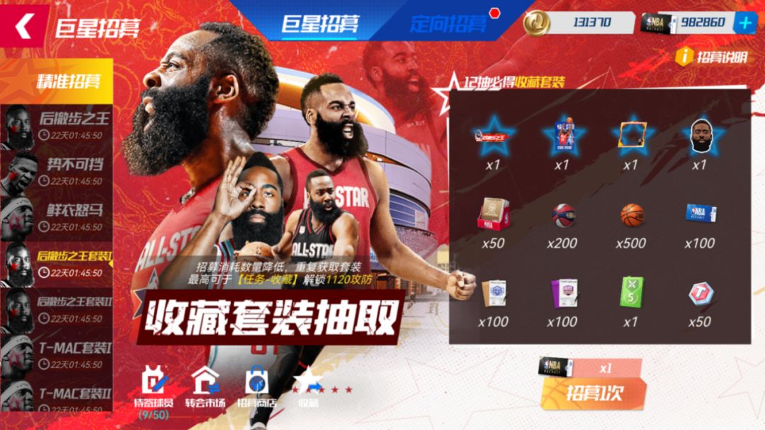 活动期间,可使用【精准招募函】在【精准招募-后撤步之王套装卡池I】、【精准招募-后撤步之王套装卡池II】池中,抽取全明星哈登的专属外显套装。