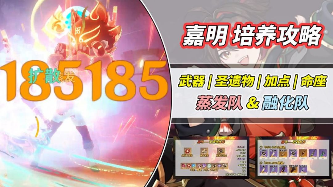 蒸发队:嘉明+班尼特+芙宁娜/夜兰/行秋+闲云/万叶/砂糖。嘉明自身拥有提升跳跃的能力,闲云并非必带,万叶双扩、砂糖精通提升,都是不错的辅助选择。队伍选择行秋、夜兰的玩家,可在嘉明每次放战技之前,衔接普攻去触发水伤协同,以此确保蒸发的稳定性~