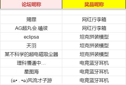 大家好,感谢大家积极的参与本次活动,现将活动中奖名单公布如下↓,没中奖的友友请不要气馁,多关注论坛最新活动公告,祝大家游戏愉快。