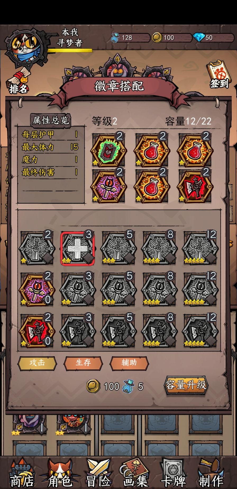 可以装备最多六个徽章,其容量之和不能超过最大容量,这个应该很好理解。最大容量是需要用金币和迷境泉水来升级的,本次测试不开放更高级徽章的获取,所以对本次测试来说初始最大容量已经够用了。