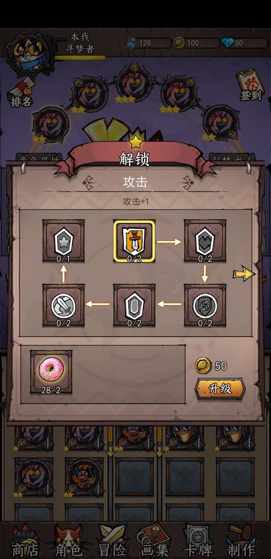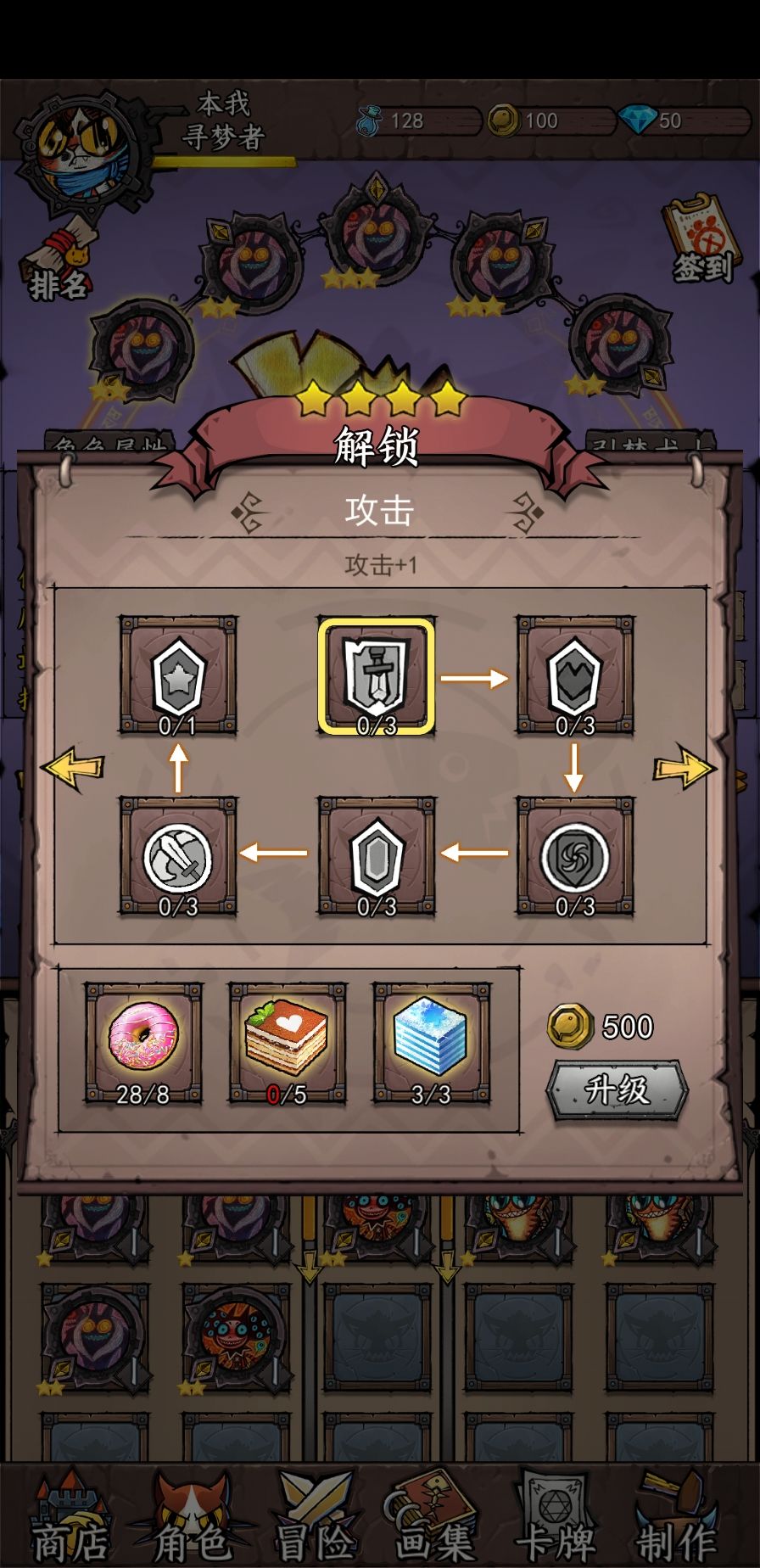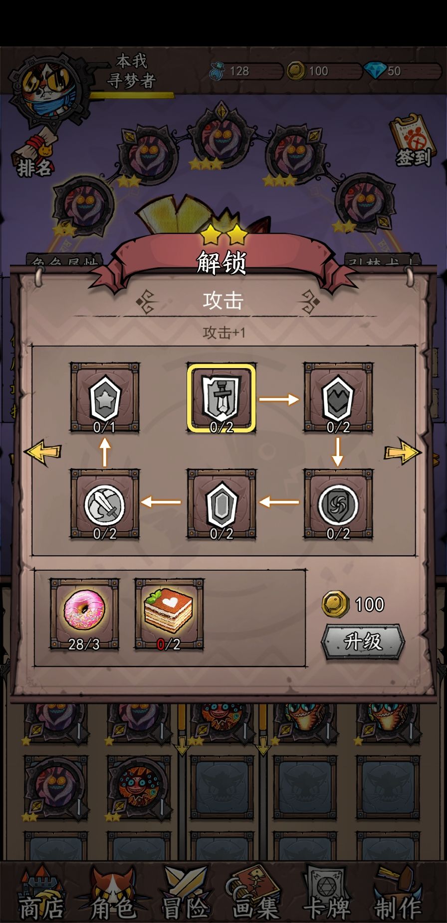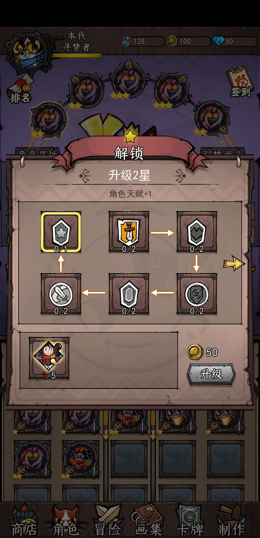 角色初始一星,在最开始的强化里,每次强化都需要两个基础材料(为了方便我就称呼强化材料级别从低到高为基础、中级和高级材料)和50金币,由于是线性强化,升级完两次攻击后才可以升级两次生命值,再依此类推,到一星最后一个强化节点上。