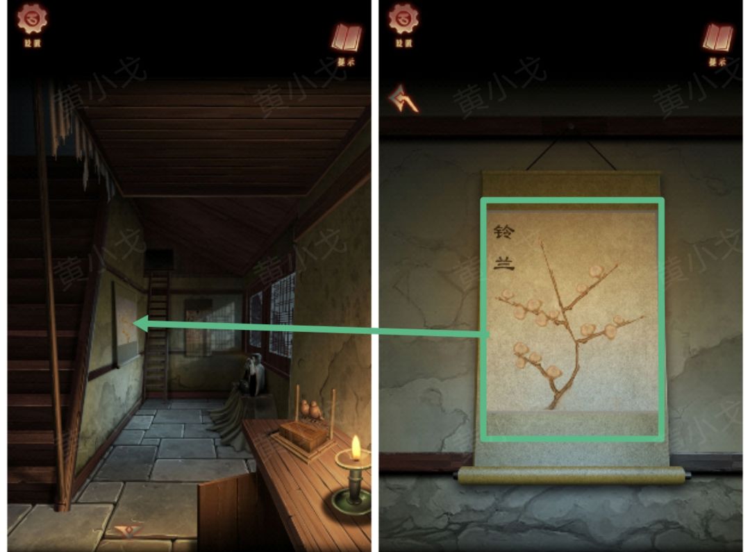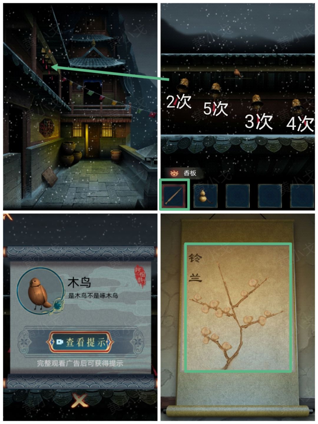 5.(过道)点击屋檐下的风铃,根据铃兰花挂画上的线索,用【香板】按顺序和次数点击风铃(从上到下:2534),获得【木鸟】