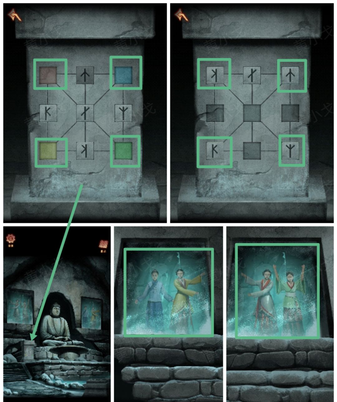 21.点击石柱,根据两边人偶的线索(姿势及衣服颜色),调整符号滑块至对应颜色的位置,触发机关