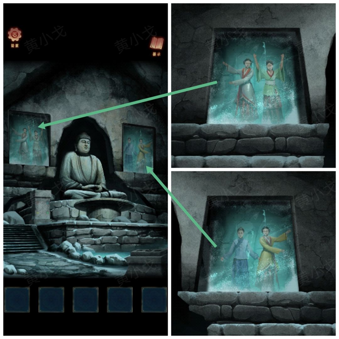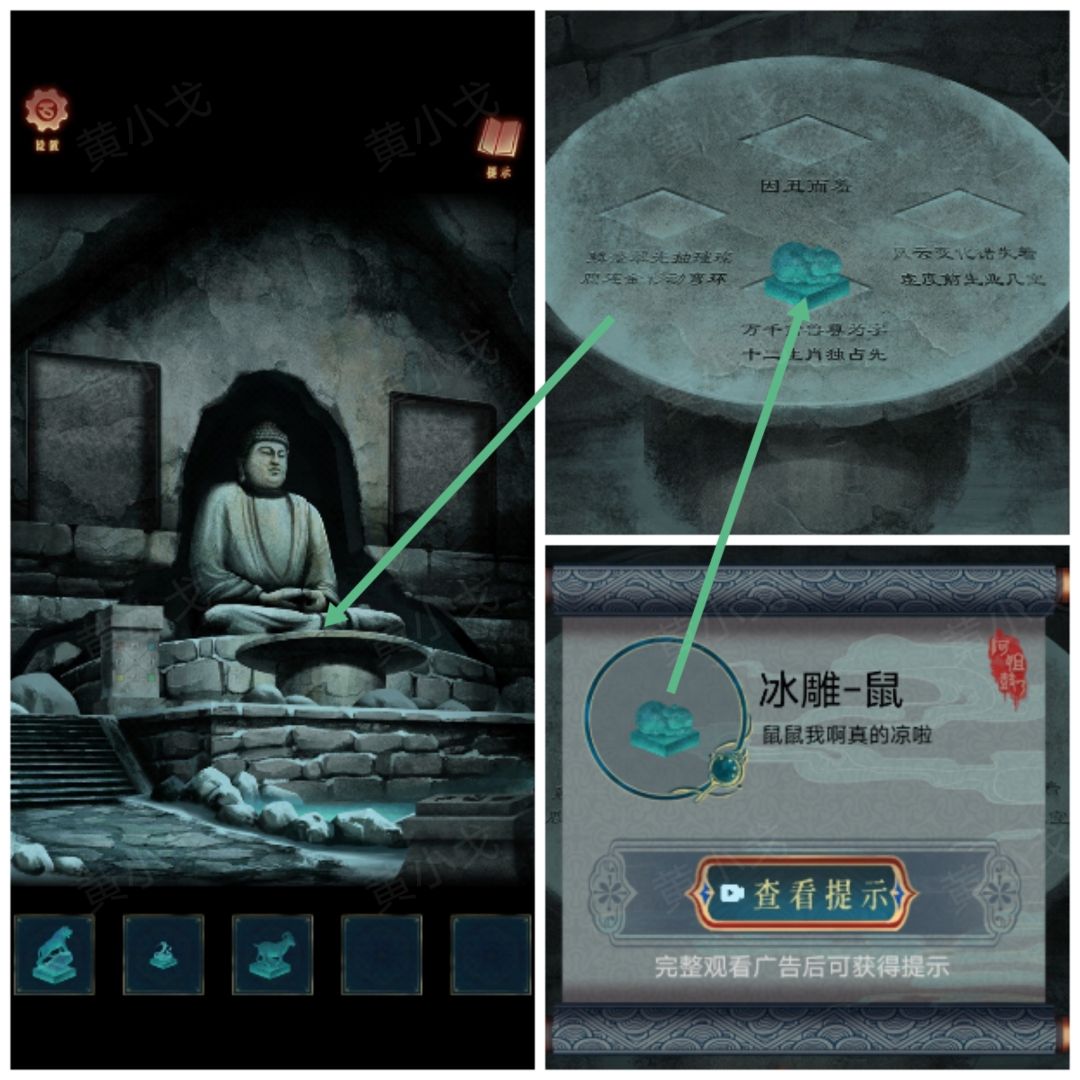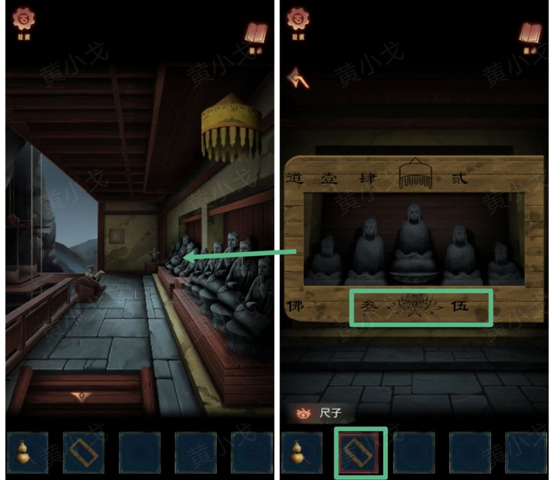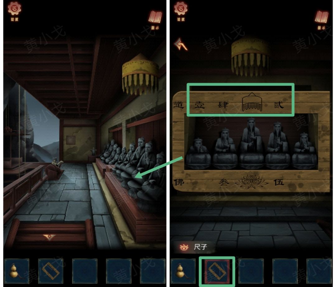 8.(庙内-二楼)点击右边的五个雕像,使用【尺子】,获得线索(注意雕像上的华盖)