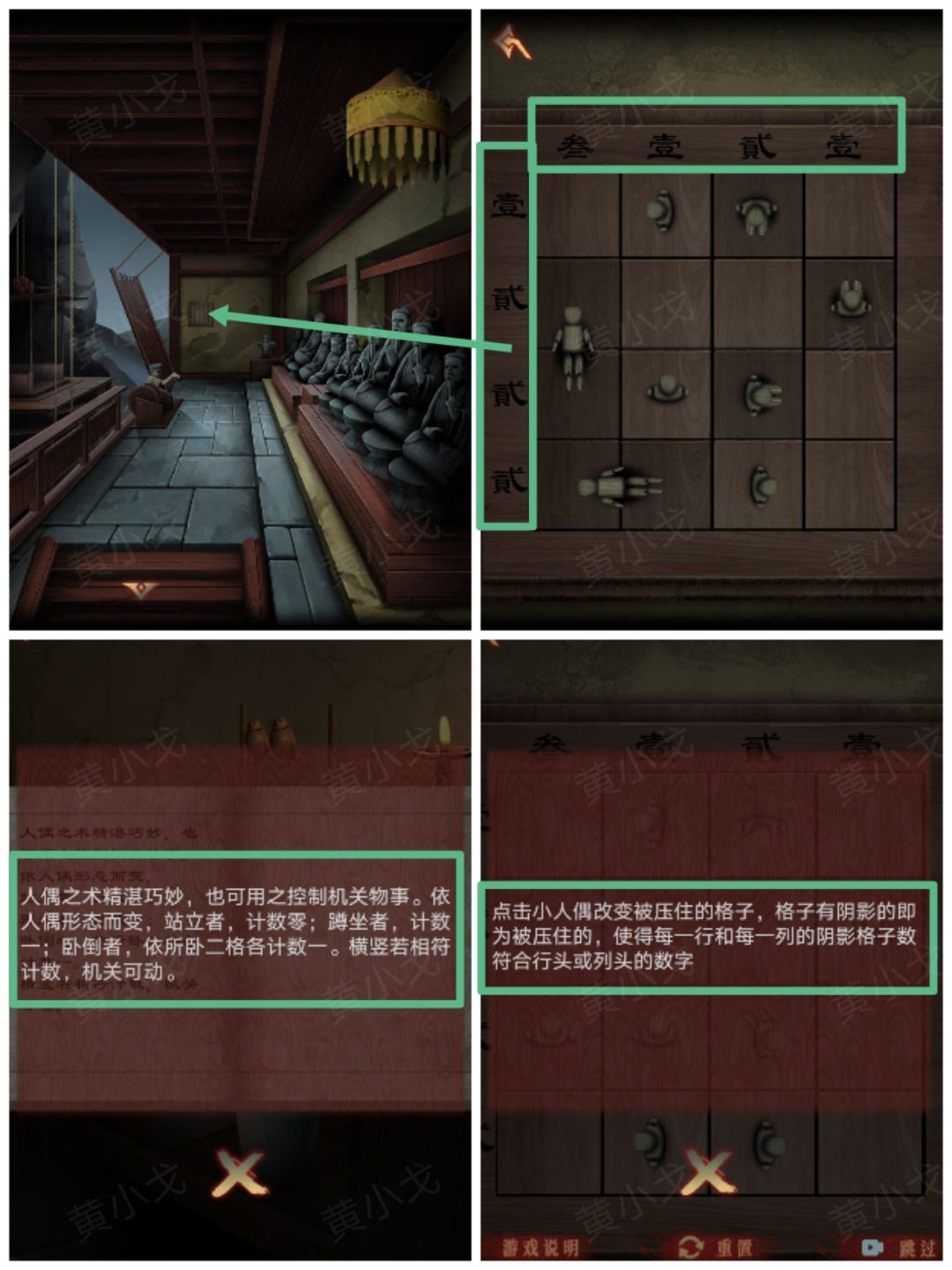 10.点击木偶头瓶子,根据上面的提示(华盖图案和倒着的莲花图案),结合两边雕像使用【尺子】后得到的线索,按顺序按下木偶的手指头