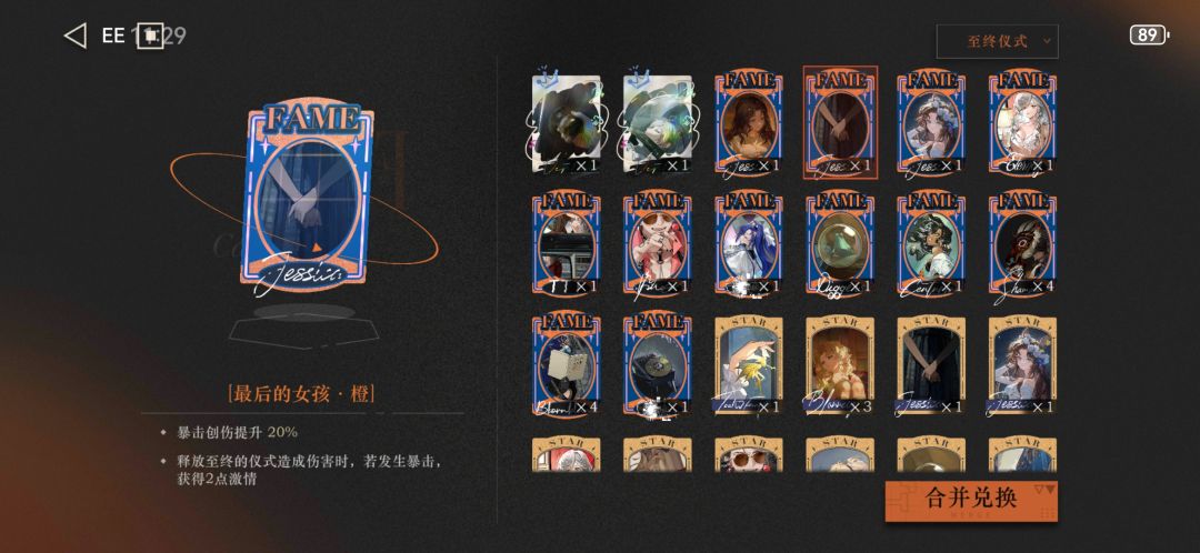 核心卡:群山一瞥-橙,每次释放仪式后全队兽角色激情+1,仪式威力+10%,多多益善,最好人手一张。
