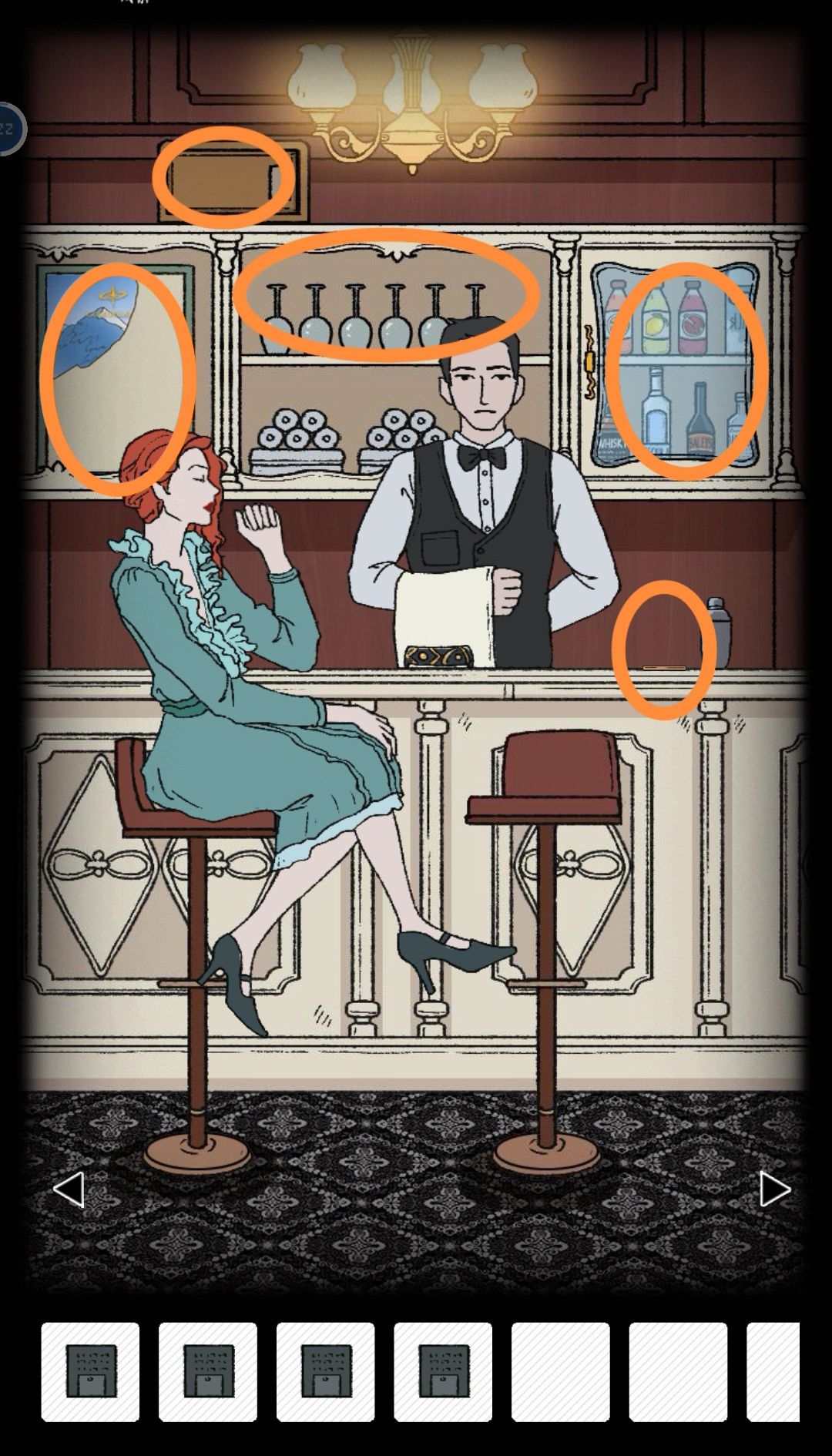 保险箱里是一把螺丝刀,柜子上有空酒杯,点击服务员和优雅女士都有一小段剧情对话。