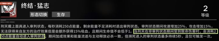 角色一技能与三技能为常规输出技能,技能给敌方添加禁能与沉默debuff,为自身添加闪避并赋予减伤,当敌方血量判定过低时会被施加“零进黑匣”斩杀。二技能巨额(相较于之前阵营限定角色)暴击/攻击加成,并且增加常驻斩杀判定。