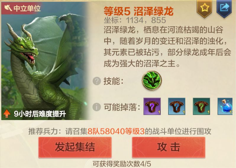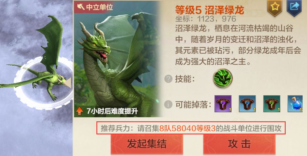 点击沼泽绿龙的属性面板,可以看到讨伐的推荐兵力,例如集结一定数量、战力、等级的部队参与围攻,基本上兵力达到要求就可以成功击败绿龙啦。