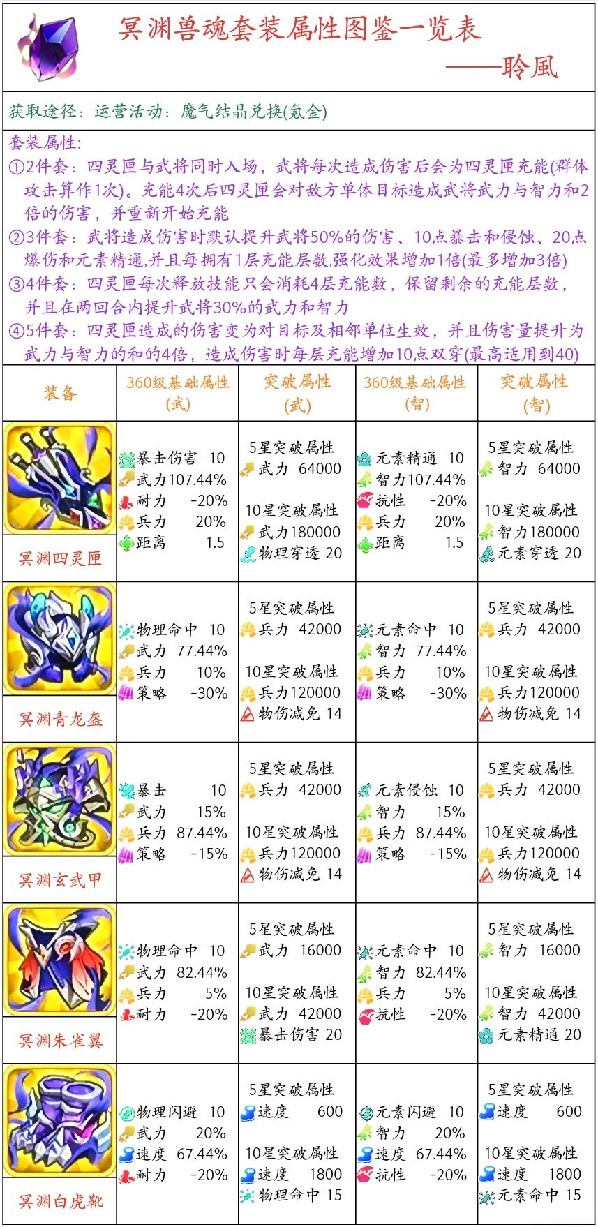 (内含套装属性,获取途径,各装备满级属 性、突破5星属性、突破10星属性)
