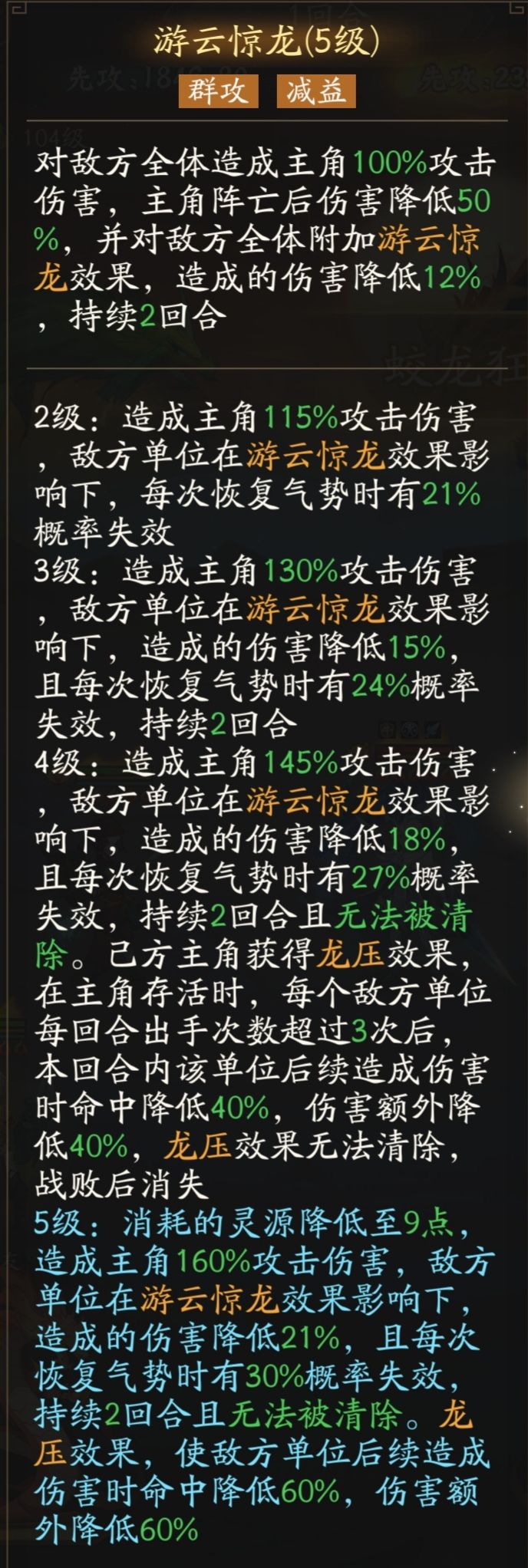 造成主角145%攻击伤害,敌方单位在【游云惊龙】效果影响下,造成的伤害降低18%,每次恢复气势有27%概率失败,持续2回合且不可清除。己方主角获得【龙压】效果,主角存活时,每个敌方单位每回合出手次数超过3次后,本回合内该单位后续造成伤害时命中降低40%,伤害额外降低40%,【龙压】不可清除,主角战败后消失。