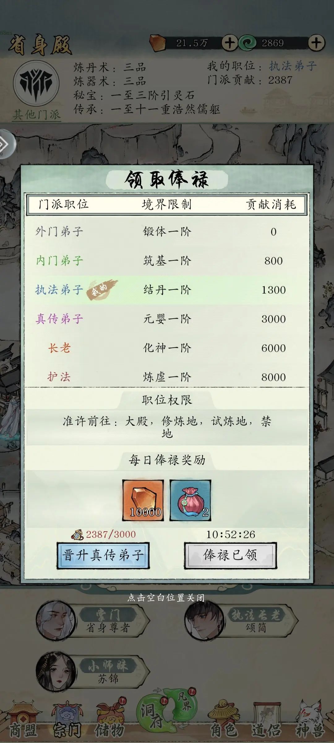 12.化神平行进二级宗门传承不掉,真传需要800+1300+3000=5100贡献,升化神任务会给2100,功法心得很重要,缺死的缺!1级门派够过任务就行。